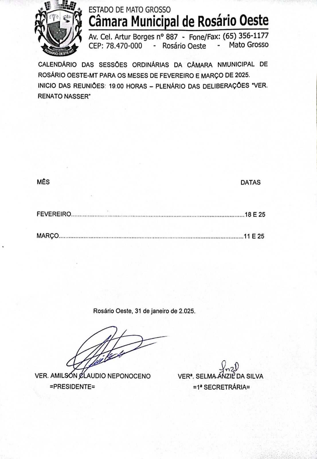 CALENDÁRIO DAS SESSÕES ORDINÁRIAS DA CÂMARA MUNICIPAL DE ROSÁRIO OESTE MATO GROSSO PERÍODO: FEVEREIRO E MARÇO/2025.