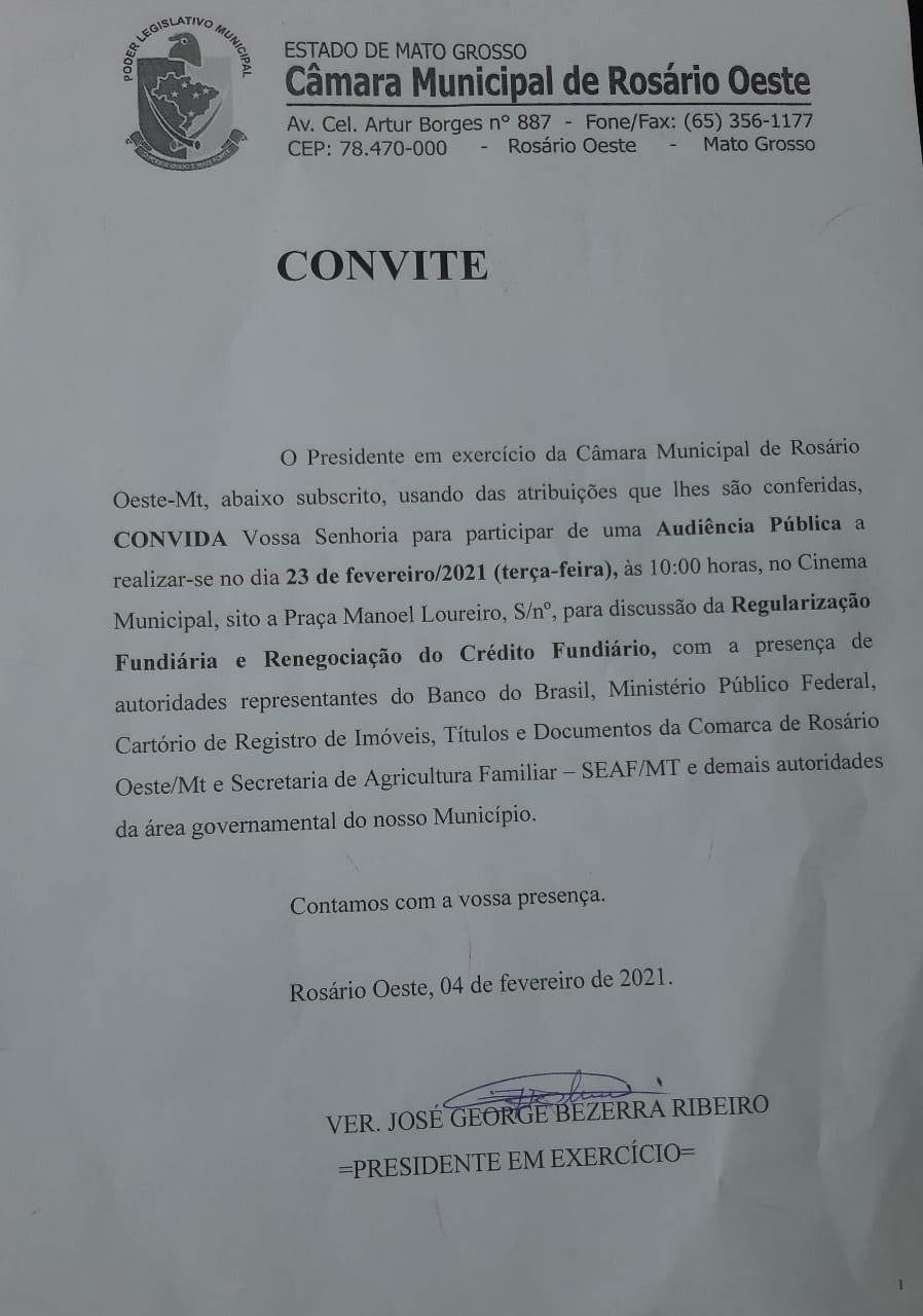 A Câmara Municipal de Rosário Oeste MT, convoca orgãos para uma Audiência Pública dia 23 de Fevereiro de 2021 as 10:00 hs.