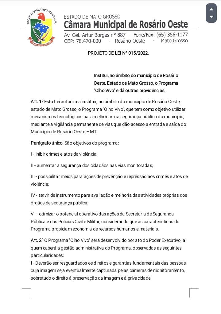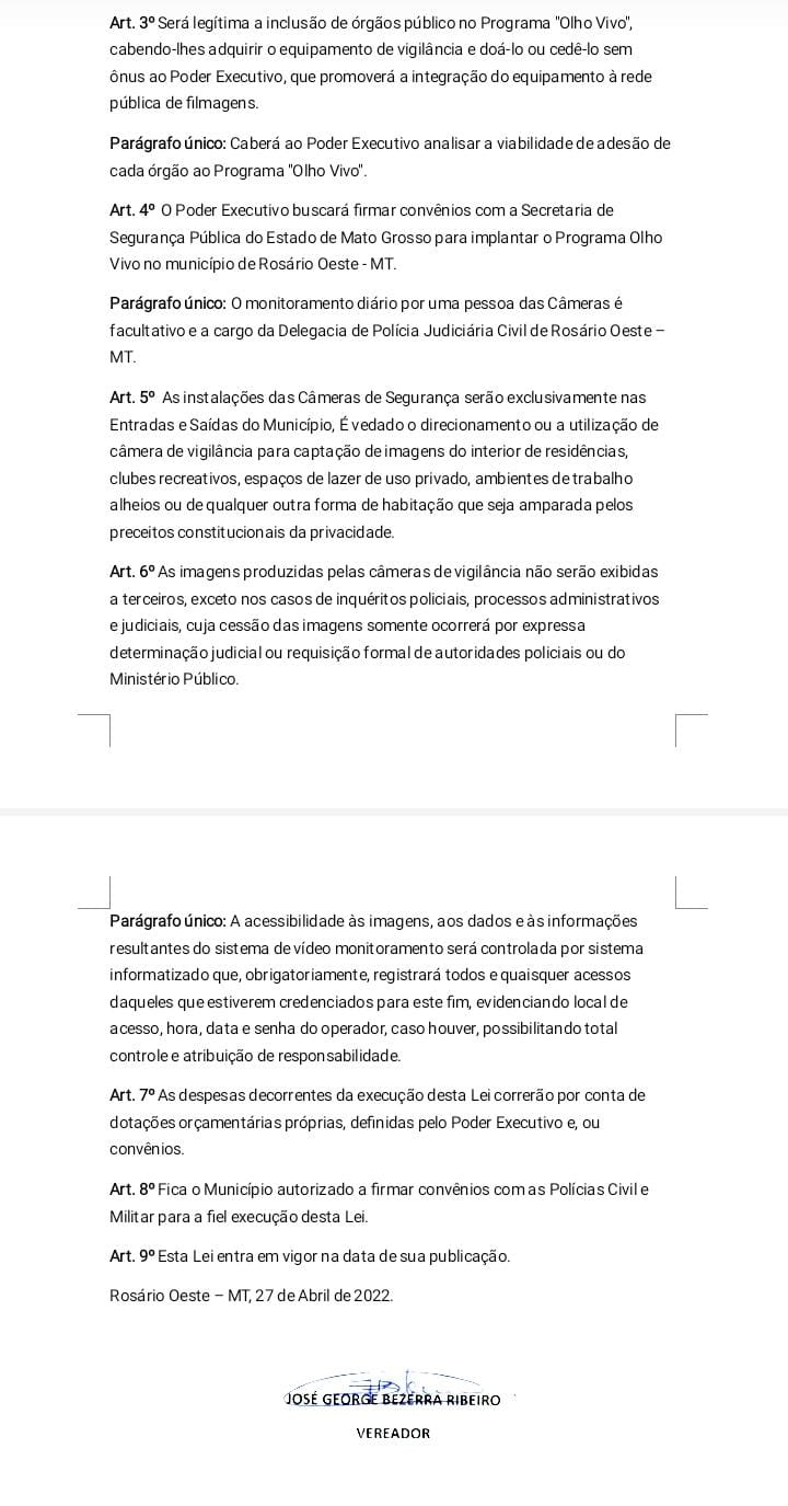 O Vereador George Ribeiro, desde os anos de 2022, 2023 e em 2024, apresentou o Projeto de Lei “Olho Vivo” que tratava justamente do monitoramento através de Câmeras de Segurança com objetivo de propor segurança para munícipes de Rosário Oeste, porém ambos os projetos foram vetados pelo prefeito municipal.