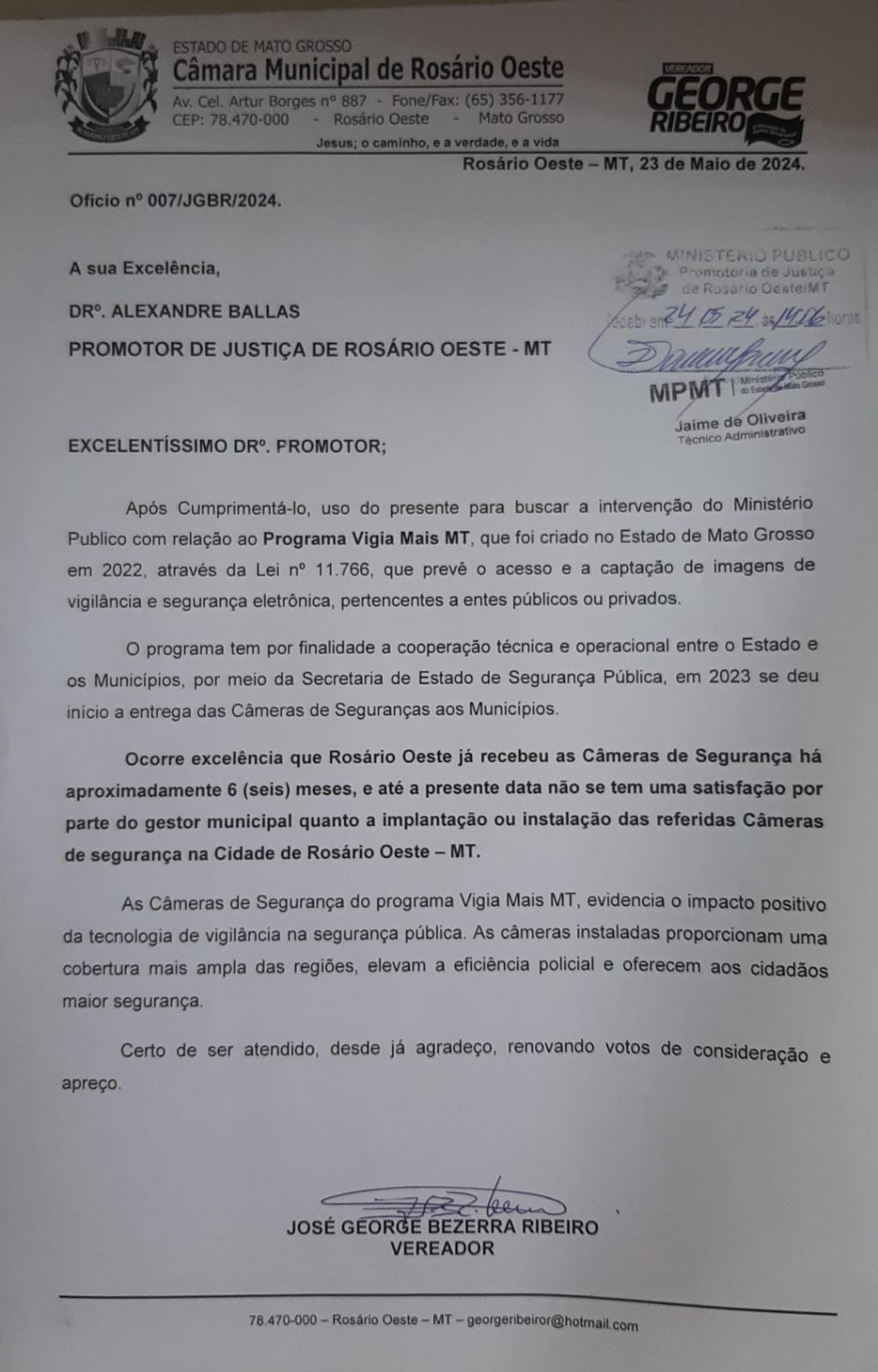 Mediante a tal descaso, o Vereador George Ribeiro recorreu ao (MP) Ministério Público para que intervenha junto a Prefeitura Municipal de Rosário Oeste – MT, para que faça a devida instalação e assim traga mais segurança para nosso município de Rosário.