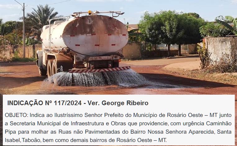 O Vereador George Ribeiro vem cobrando insistentemente para que a prefeitura municipal de Rosário Oeste através da Secretaria de Infraestrutura providencia com urgência carro pipa para molhar as ruas de Rosário Oeste.