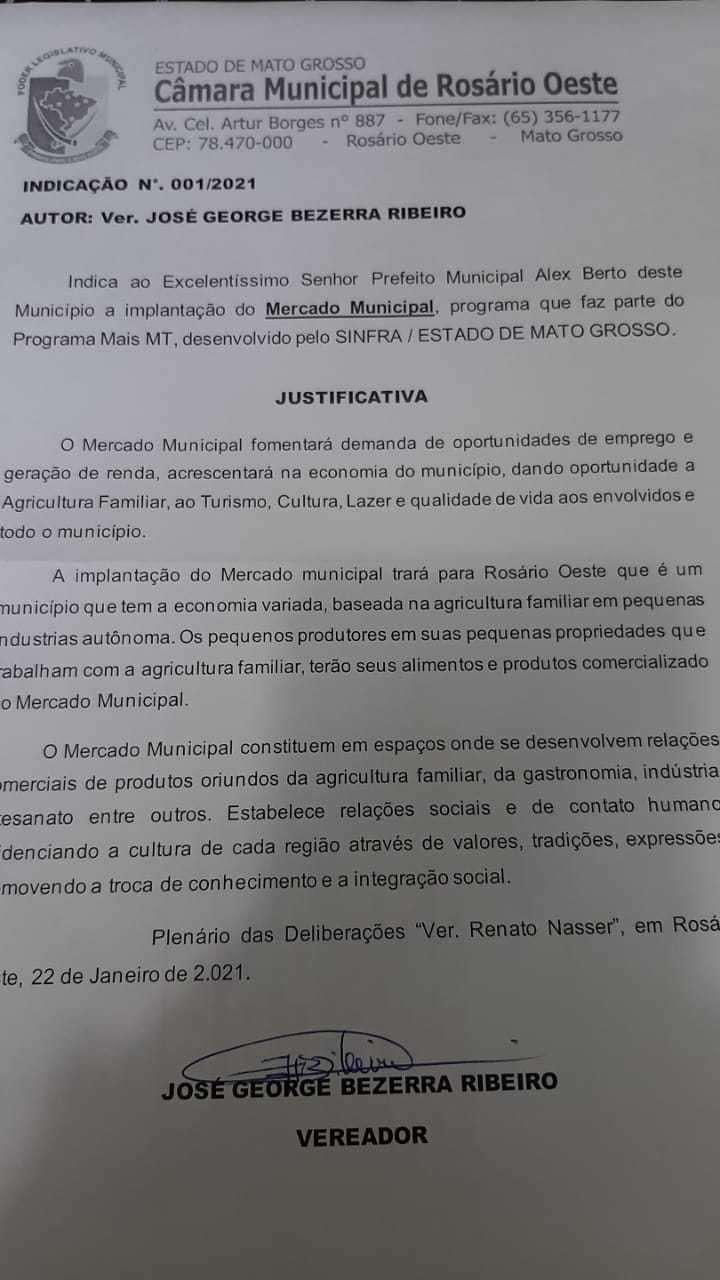 O vereador George Ribeiro (PSC) Vice Presidente da Câmara Municipal Indica ao Prefeito Municipal Alex Berto (SOLIDARIEDADE), a implantação do Projeto Mercado Municipal, através do programa (Mais MT), desenvolvido pela Secretaria de Estado de Infraestrutura e Logística (Sinfra).