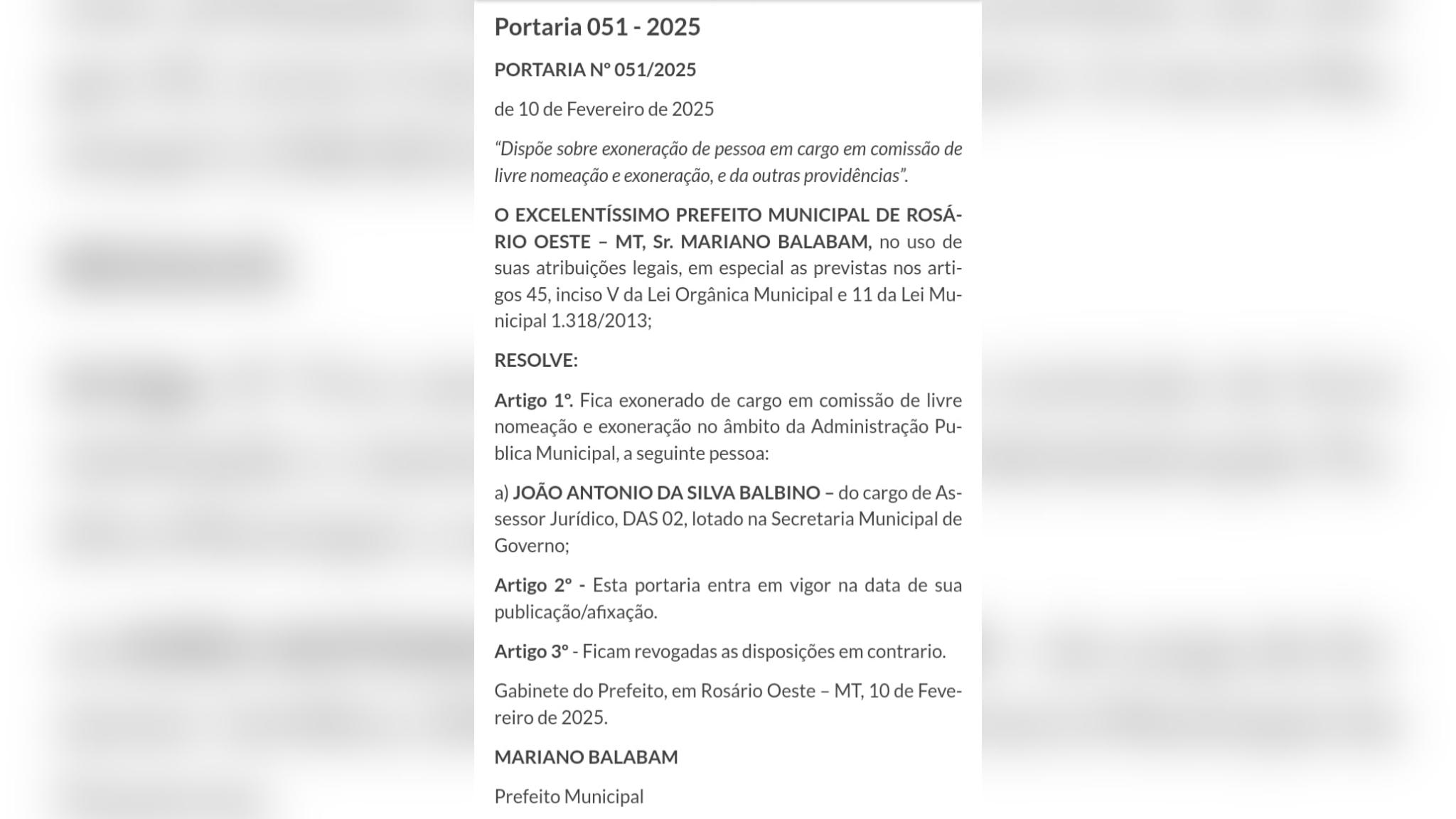 A exoneração foi confirmada através da publicação oficial. A Câmara Municipal levantou questões legítimas sobre a situação jurídica de Balbino e sua capacidade de atuar como assessor jurídico, quais não poderia ser ignorada por Balabam.