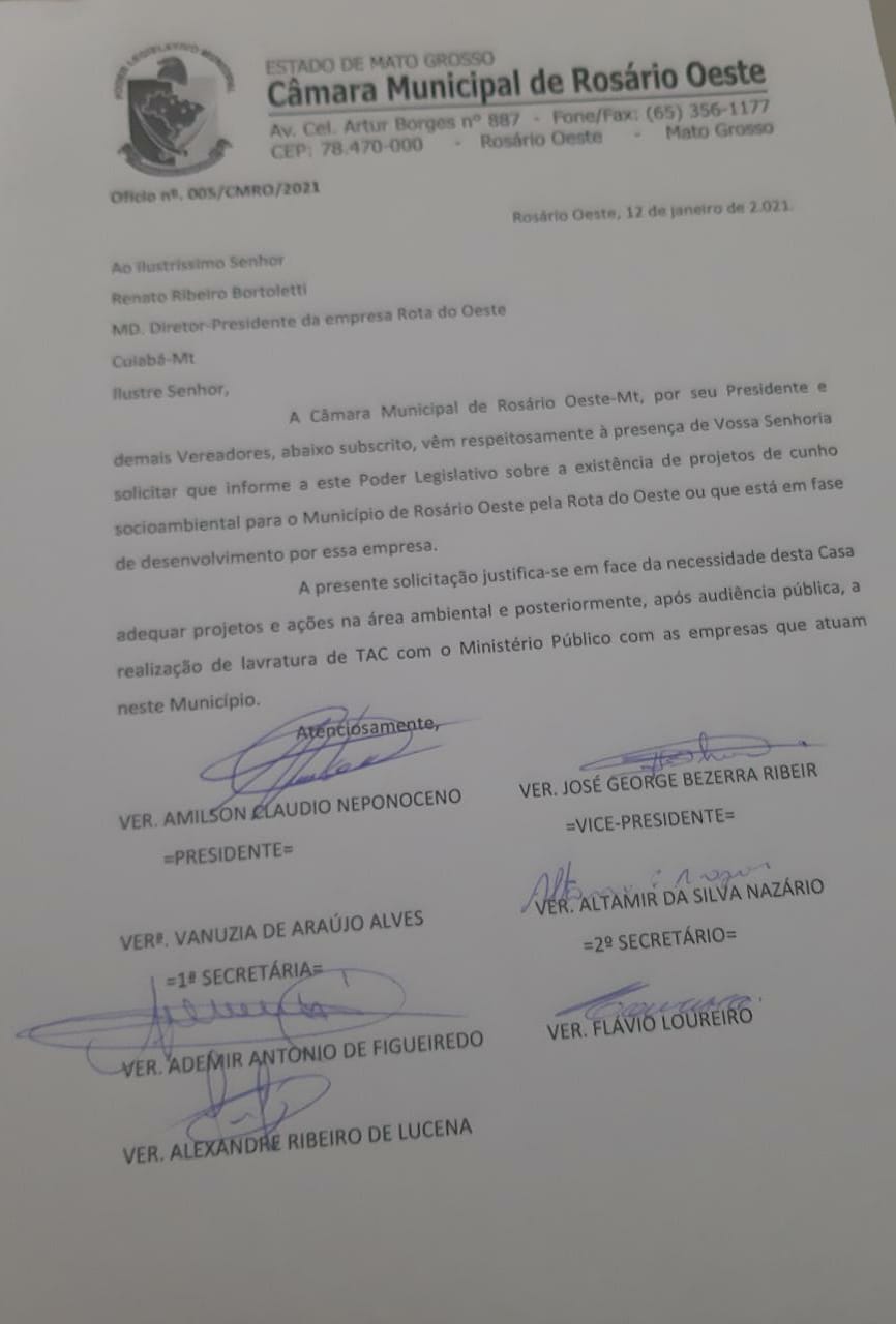 Presidente da câmara e vereadores solicitam da empresa Rota do Oeste, apresentação de projetos socioambientais.