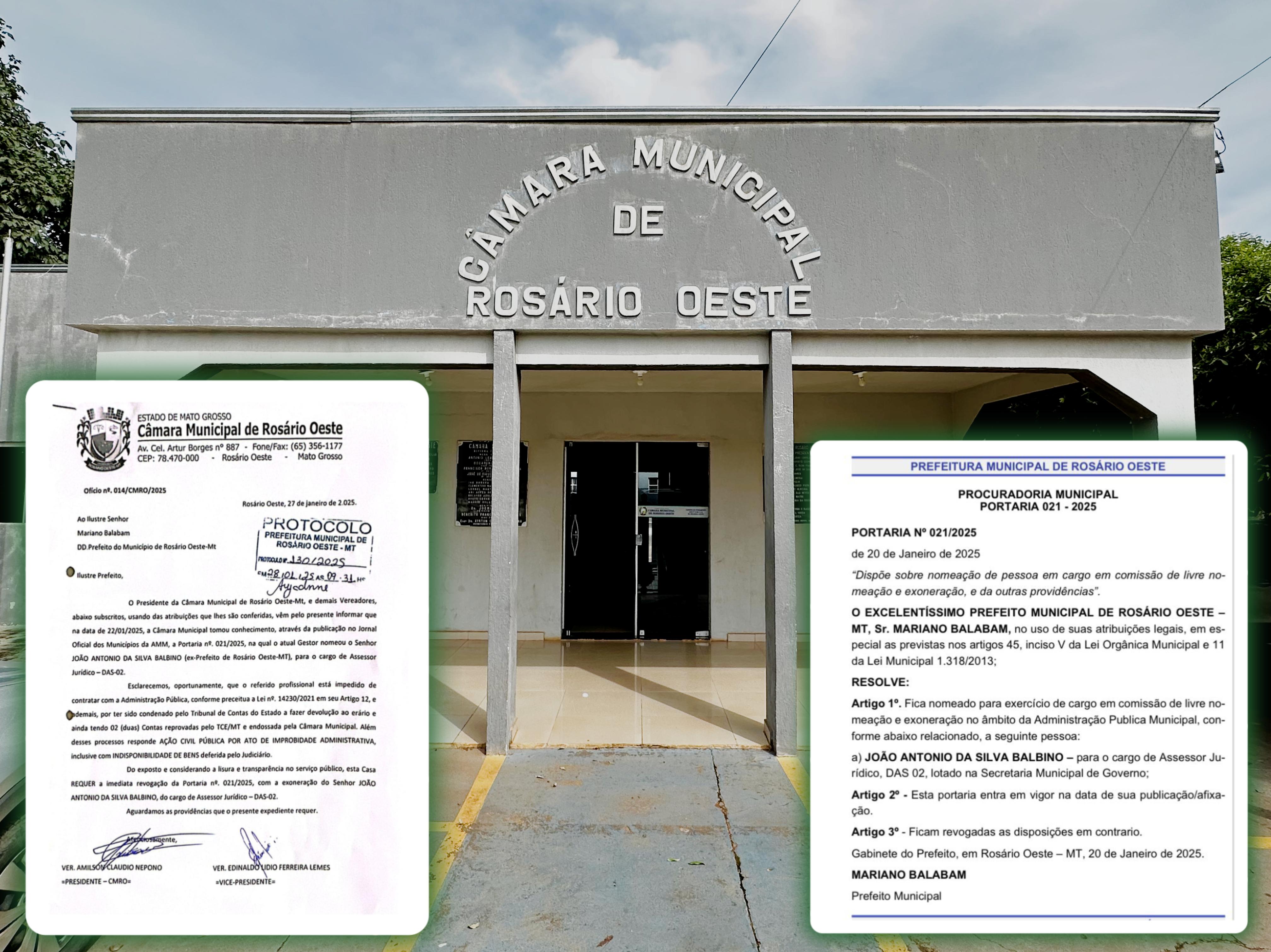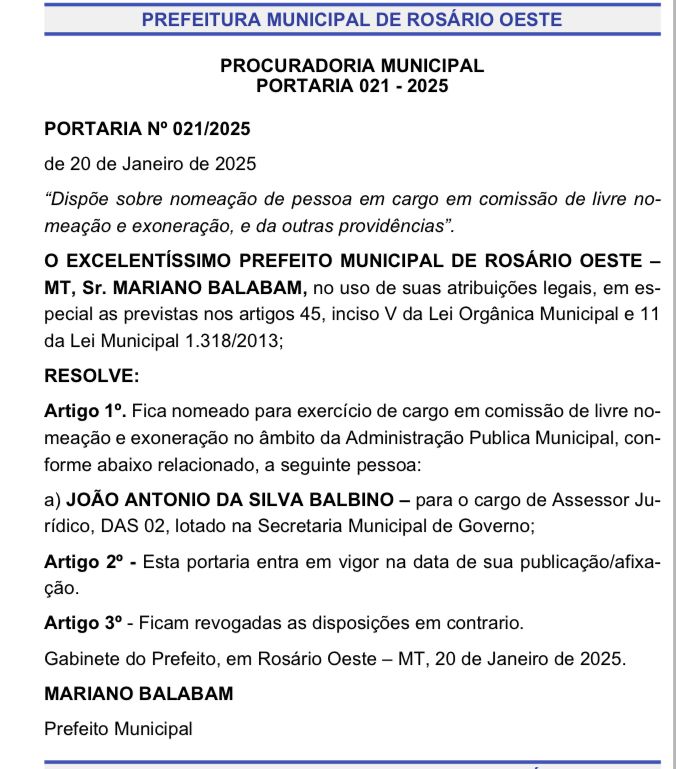 “vêm, pelo presente, informar que, na data de 22 de janeiro de 2025, a Câmara Municipal tomou conhecimento, através da publicação no Jornal Oficial dos Municípios da Associação Mato-grossense dos Municípios (AMM), da Portaria nº 021/2025. A referida Portaria nomeia o Senhor João Antônio da Silva Balbino, ex-Prefeito de Rosário Oeste-MT, para ocupar o cargo de Assessor Jurídico - DAS-02”.