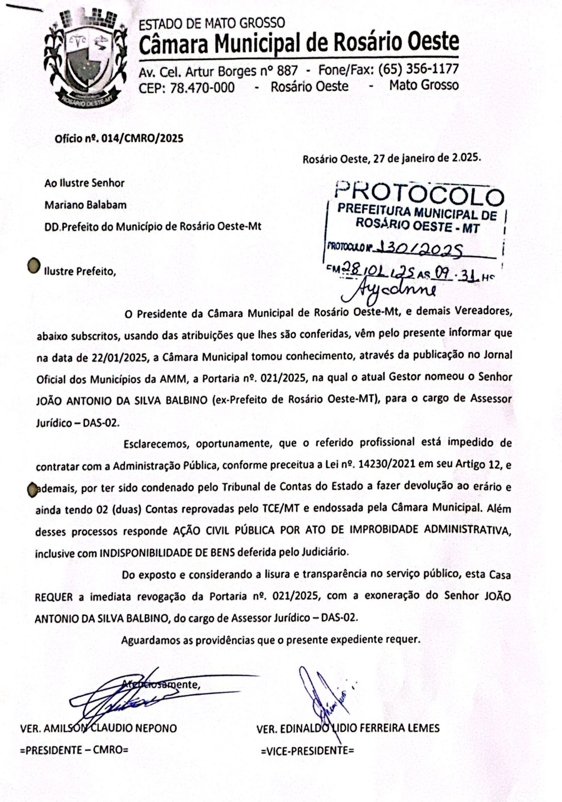 Presidente da Câmara Municipal de Rosário Oeste-MT, e demais Vereadores solicita revogação da Portaria nº 021/2025 e exoneração do Senhor João Antônio da Silva Balbino (Ex-Prefeito de Rosário Oeste-MT).