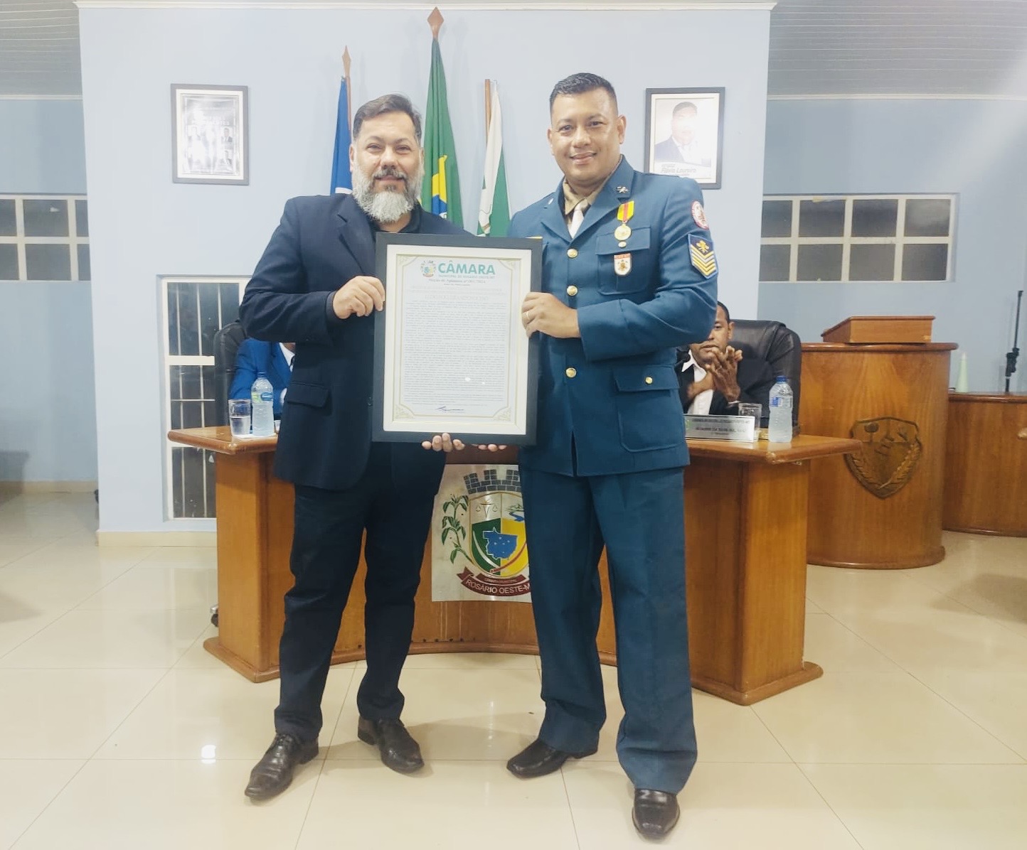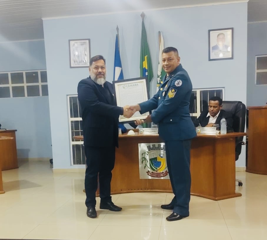 Nesta última Sessão Ordinária o Presidente da Câmara Municipal de Rosário Oeste, Flávio Loureiro acompanhado dos demais Vereadores realizaram na Sessão Ordinária uma homenagem ao Sgt do Corpo de Bombeiros Lúdio Nogueira Neponoceno, por ato de bravura.