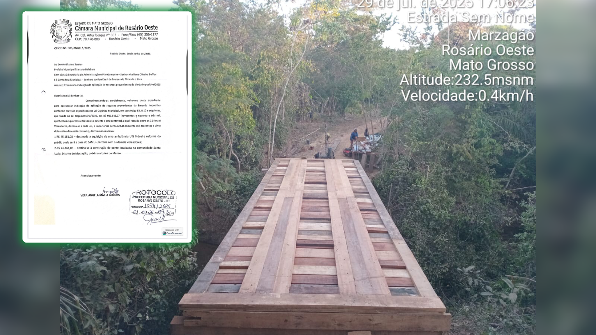 “É com alegria que vejo mais uma indicação atendida, fruto do nosso compromisso com as comunidades rurais. Essa ponte é mais do que madeira; é dignidade, é respeito com o povo do Marzagão. Agradeço ao Prefeito Mariano pela sensibilidade em executar essa importante obra”, destacou a Vereadora Ângela Tete.