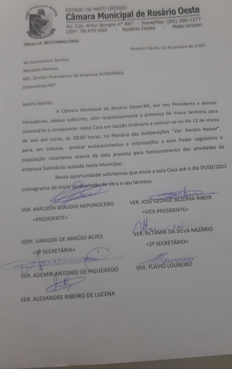 Vereadores convocam empresa sediada no Município para uma audiência no plenário da casa de leis do Município de Rosário oeste.