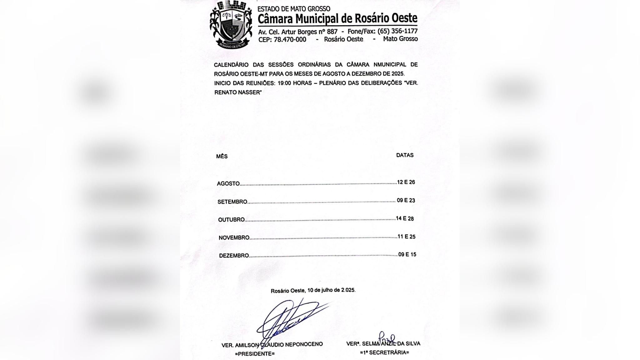 CALENDÁRIO DAS SESSÕES ORDINÁRIAS – CÂMARA MUNICIPAL DE ROSÁRIO OESTE-MT (AGOSTO A DEZEMBRO DE 2025)